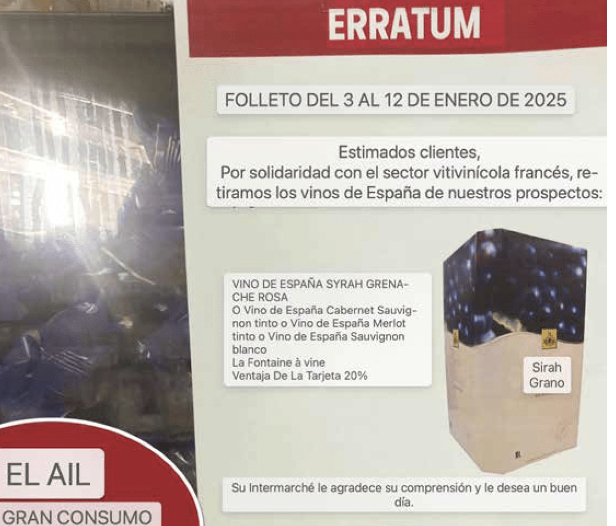 Es una erratum visto esta semana en Intermarché… “Por solidaridad con el sector vitivinícola francés, eliminamos los vinos de España de nuestros folletos destacados”. Pasaremos rápidamente al sentido principal del mensaje: ¿los 10 litros de vino de España simplemente desaparecieron de los folletos (a los que no sirve para nada una erratum) o de las […]