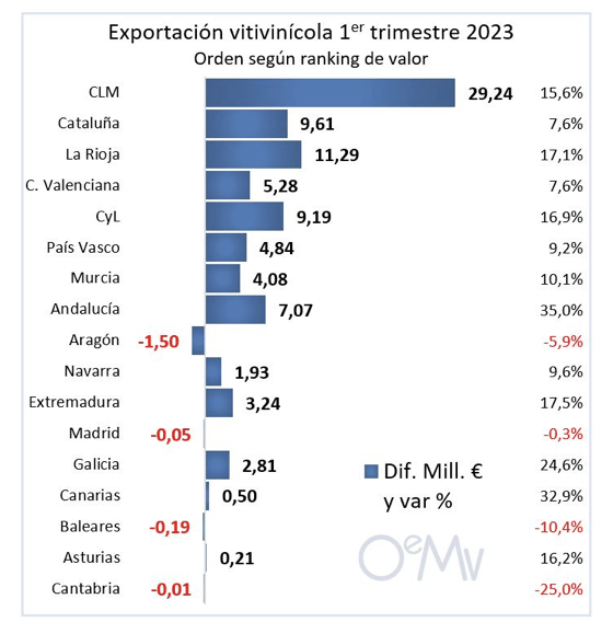 España aumentó un 12,2% su facturación por exportación vitivinícola en el primer trimestre de 2023, hasta superar los 800 millones de euros. 13 de las 17 comunidades autónomas españolas crecieron en valor, aunque fueron 8 las que lo hicieron en volumen. Castilla-La Mancha (+29,2 millones €) y La Rioja (+11,3 millones), en valor, y Extremadura (+5,8 millones de litros) y Andalucía (+3,3 millones), en volumen, fueron las que más crecieron en términos absolutos.