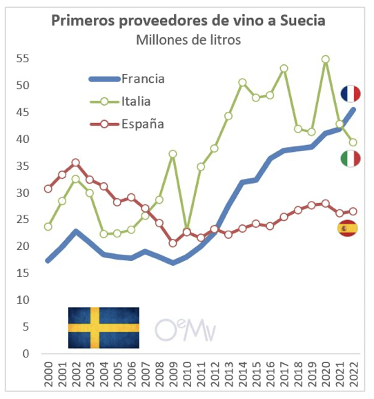 Francia ganó bastante cuota y se situó por primera vez en su historia como principal proveedor de vino a Suecia en términos de volumen, superando a Italia.