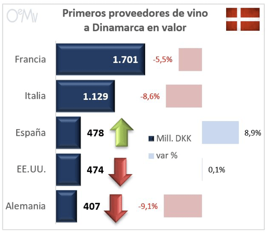 Dinamarca redujo sus importaciones de vino un 8,4% en volumen y un 2,9% en valor en 2022, hasta los 181,6 millones de litros y los 5.840 millones de coronas, tras un buen 2021. Fue superado por Suecia como primer mercado escandinavo en valor.