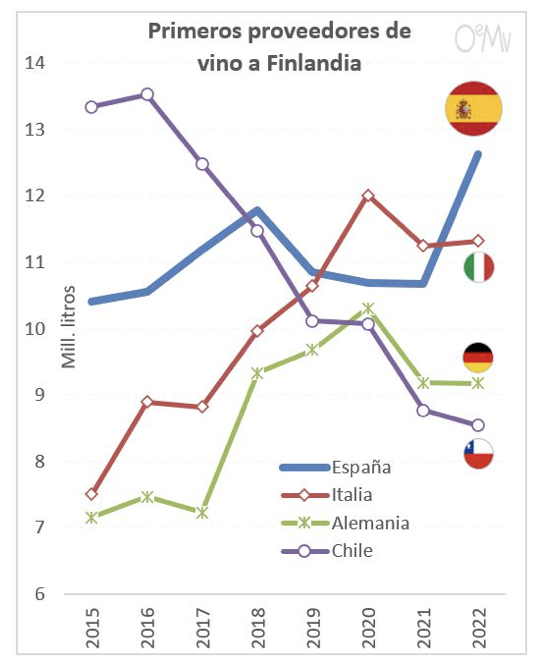 Finlandia importó un 3,9% más de vino en 2022, hasta los 74 millones de litros, aún por detrás del récord de 2020 (80 millones).