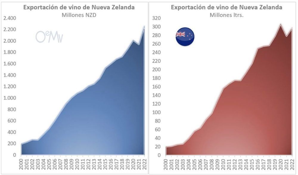 Nueva Zelanda aumentó sus exportaciones de vino en 2022 un 6,9% en volumen y un 16,2% en valor, hasta los 298,3 millones de litros y los 2.260 millones de dólares. Se sobrepuso al traspiés de 2021 y obtuvo el pasado año la mayor facturación de su historia, exportando la segunda mayor cantidad de vino hasta ahora, tras los 307 millones de 2020.