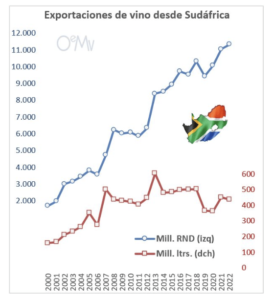 En 2022, Sudáfrica aumentó el valor de sus exportaciones de vino por tercer año consecutivo, hasta alcanzar los 11.336 millones de rands (unos 653 millones €), máximo histórico. Sin embargo, redujo un 3,7% el volumen exportado, hasta bajar de los 435 millones de litros, tras recuperar en 2021 parte de lo que perdió en 2019 y 2020.