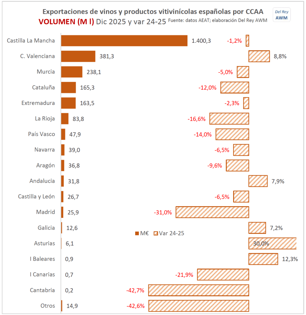 23 febrero 2026.- Dentro de un contexto difícil a nivel internacional, las exportaciones españolas de vino y productos vitivinícolas, según datos de la AEAT analizados por Del Rey AWM, cerraron el pasado año con una caída del 3,3% en valor hasta los 3.452,7 millones de euros y del 2,8% en volumen hasta los 26,8 millones de hectolitros, manteniendo prácticamente iguales sus precios medios (-0,5%). Sin embargo, dentro de esta evolución general y derivado de las tendencias en consumo y ventas que se vienen produciendo desde hace algunos años, las diferencias son importantes entre CCAA.