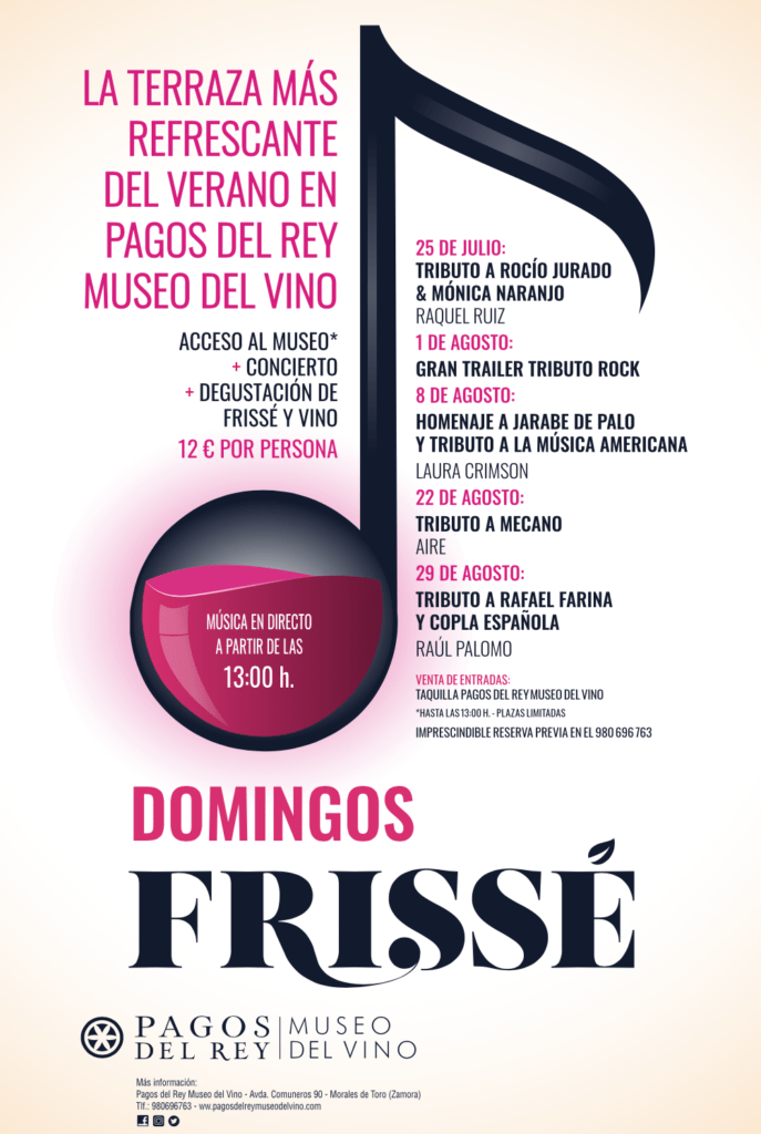 Todos los Frissé comienzan a las 13:00 h., las entradas cuestan 12 € y dan derecho a visitar el Museo en modalidad libre entre las 11.00 y las 13:00 h, y a disfrutar del concierto y de la degustación de vinos Pagos del Rey y Frissé.