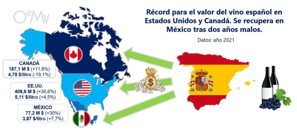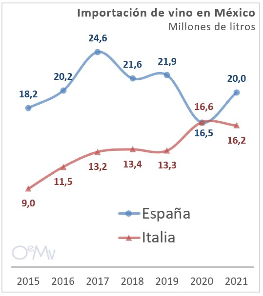 México aumentó un 20,8% el volumen de vino español importado en 2021, el cual superó dos años después al italiano (-2,3%) como el más adquirido. En términos de valor, España (+30%) creció el doble que Italia (+15%) y refuerza su liderazgo, a un precio medio superior al de Italia y Chile, sus dos principales competidores.