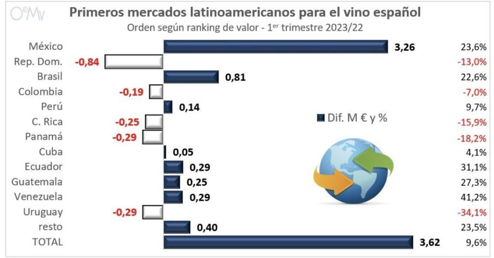 Exportaciones españolas de vino a Latinoamérica y Caribe – Primer trimestre 2023