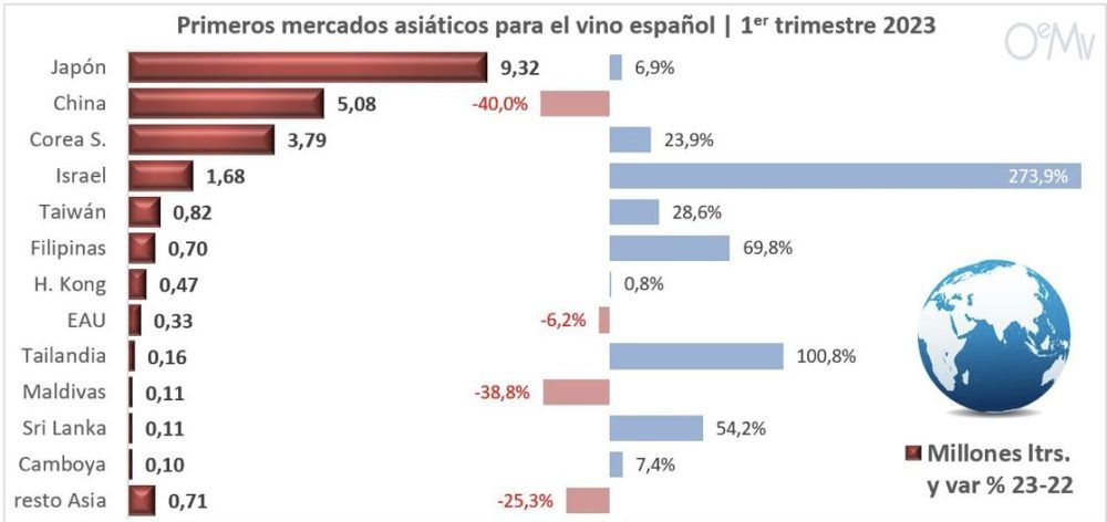 Las exportaciones españolas de vino al continente asiático se mantuvieron relativamente estables en el primer trimestre de 2023. Las ventas a China siguen registrando fuertes pérdidas. En cambio, Japón creció a buen ritmo y se consolida como nuestro primer mercado asiático, en un excelente trimestre para Corea del Sur, Israel, Taiwán, Filipinas o Tailandia.