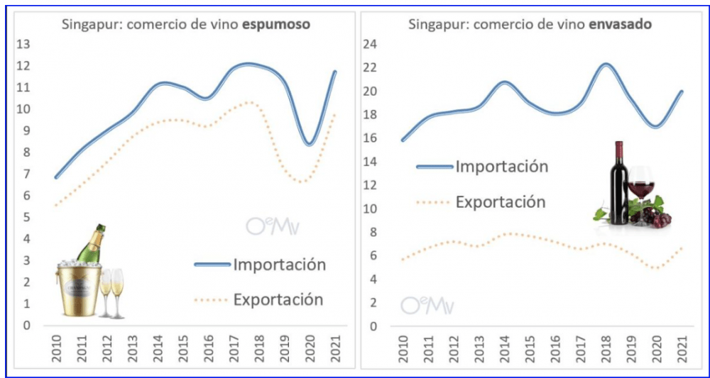 En 2020, año complicado por las restricciones comerciales derivadas de la pandemia, las importaciones de vino en Singapur registraron fuertes pérdidas. Sin embargo, se han recuperado en 2021 al alcanzar su máximo histórico en valor y el segundo mayor volumen adquirido hasta la fecha.