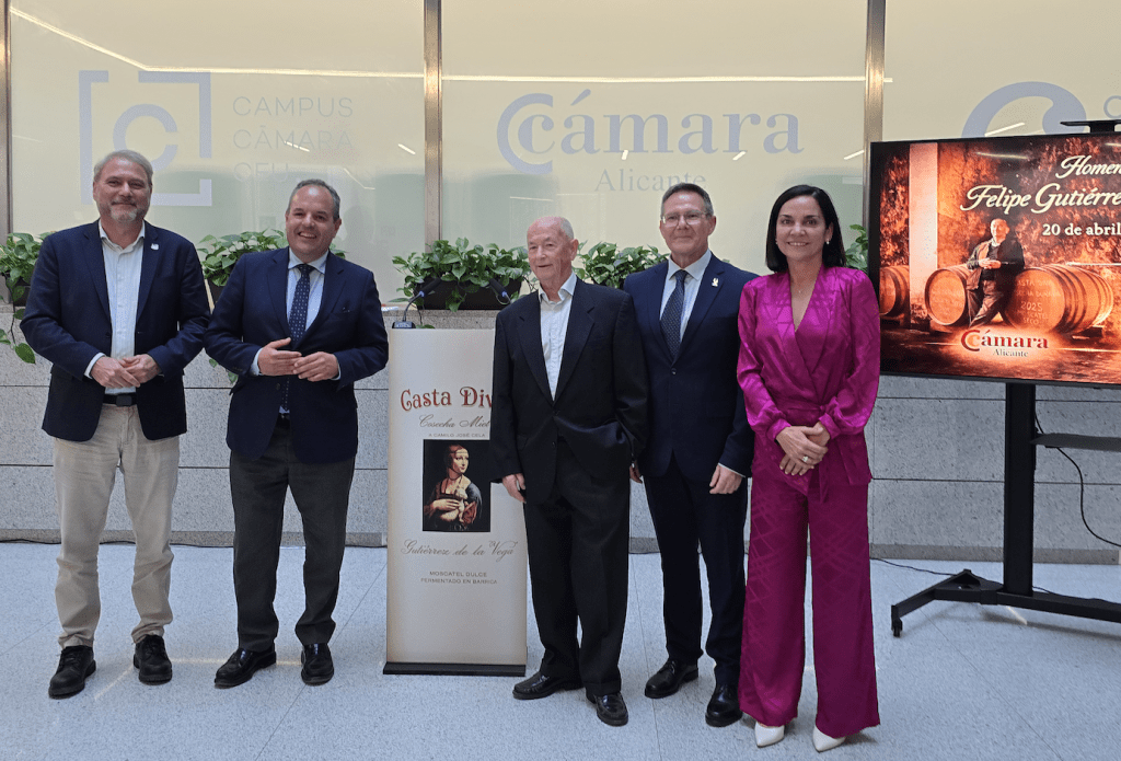 La Cámara de Comercio de Alicante y la Asociación de Sumilleres de la Provincia de Alicante (ASPA) han celebrado un acto institucional de homenaje al elaborador de vinos Felipe Gutiérrez de la Vega. El evento ha tenido lugar en el hall de la Cámara y ha reunido a representantes del ámbito institucional, académico y empresarial, así como a profesionales del sector vitivinícola.