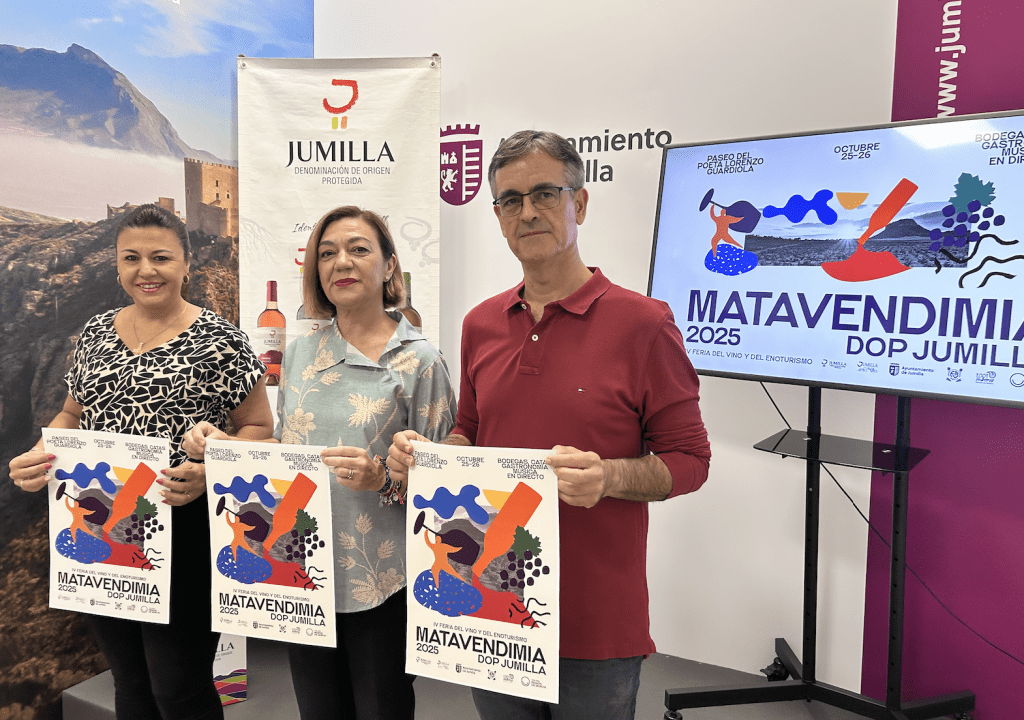 Jumilla, 23 de septiembre 2025. Hoy se ha presentado en el Ayuntamiento de Jumilla, la cuarta edición de la Matavendimia, la Gran Feria del Vino y del Enoturismo DOP Jumilla.  La alcaldesa de Jumilla, Seve González, la concejal de Turismo del Ayuntamiento de Jumilla, Asunción Navarro y el presidente del Consejo Regulador de la DOP Jumilla y de la Ruta del Vino Jumilla, Silvano García, han reunido esta mañana a los medios para dar a conocer las principales novedades de esta edición, que tendrá lugar en Jumilla los días 25 y 26 de octubre, y que, debido a las obras del mercado, cambia su ubicación al Paseo del Poeta Lorenzo Guardiola y aparcamiento de la piscina climatizada, en el centro de Jumilla.