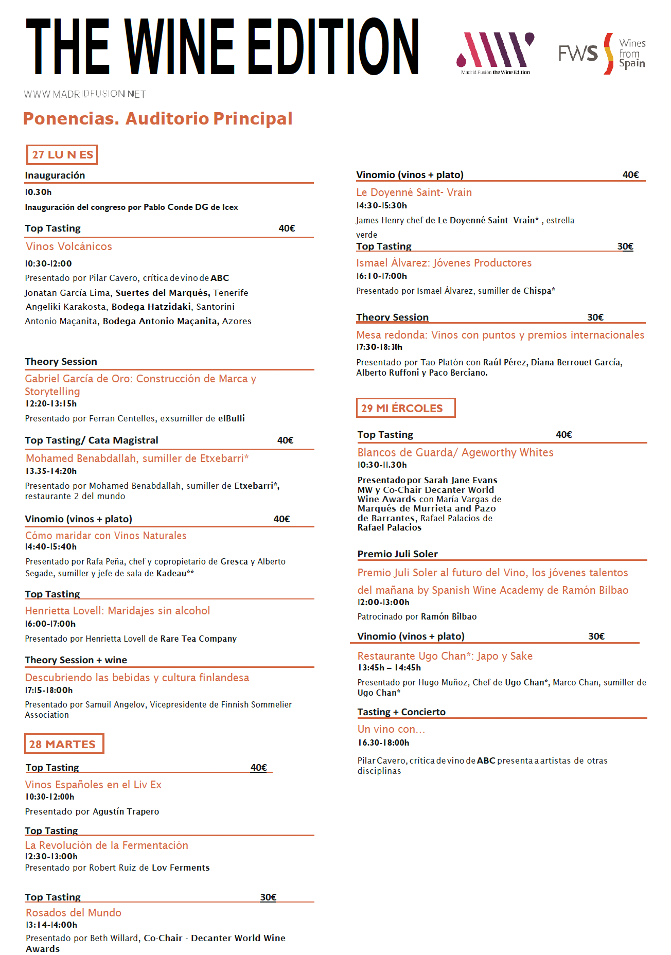 Como en la anterior edición, el acceso a la zona expositiva The Wine Edition Wines from Spain será libre y tendrá una programación de más de 15 catas abiertas de diferentes bodegas y orígenes, mientras que la entrada al auditorio del congreso del vino se realizará mediante la compra de tickets individualizados para cada cata en www.madridfusion.net. También se podrán comprar días sueltos completos.