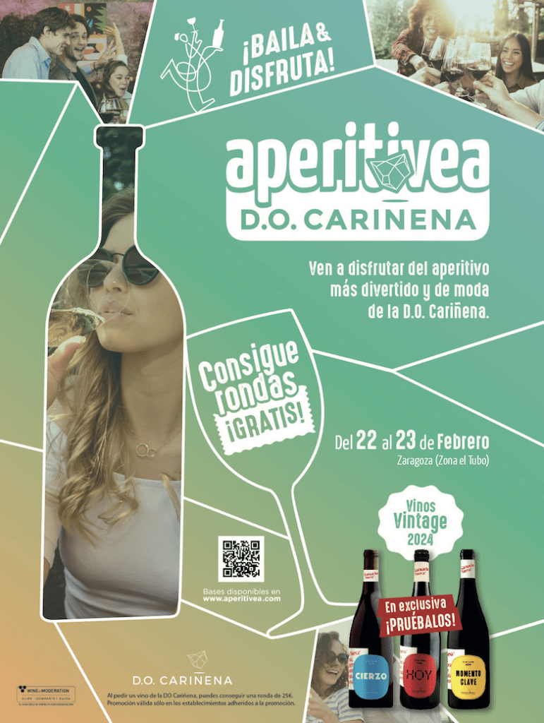 (Viernes, 21 de febrero de 2025).- Vinos frescos y vibrantes –de garnacha nueva y baja graduación-, gastronomía, premios exclusivos y el mejor ambiente y diversión en el aperitivo e incluso hasta el tardeo. Así es “Aperitivea con D.O. Cariñena”, la innovadora iniciativa que ha conquistado Madrid y que mañana sábado 22 y el domingo 23 llega a 15 bares del Tubo, la emblemática zona de tapas de la capital aragonesa.