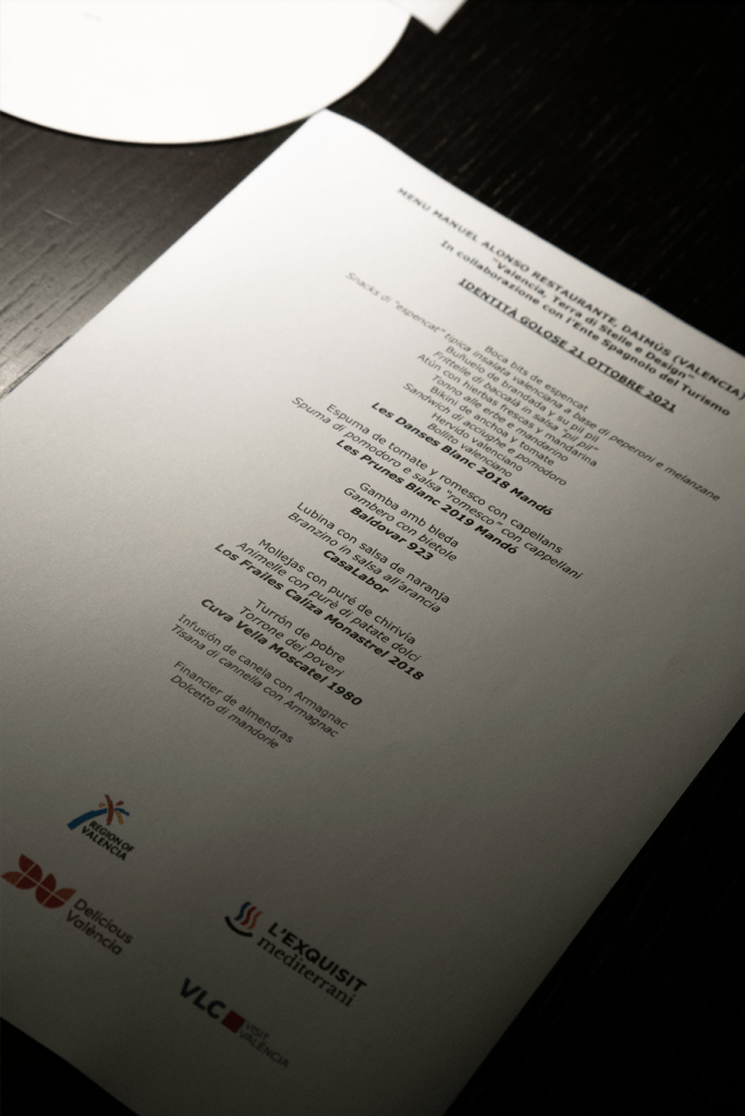 Les Danses espumoso Blanc de Mandó y Les Prunes,  ambos elaborados por Celler del Roure;  el blanco Rascaña, de Baldovar 923; Casa Labor tinto, de Rafael Cambra; Caliza Monastrell tinto, de Casa  Los Frailes y elCuva Vella Moscatel Vintage 1980, de Bodegas Valsangiacomo, fueron las referencias que armonizaron el menú, elaborado por Manuel Alonso.