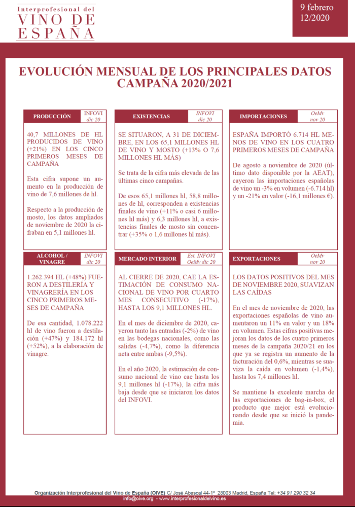 Datos Septiembre 2020 En los dos primeros meses de la campaña 2020/21, la producción de vino se sitúa en los 27,5 millones de hl, que suponen 4,9 millones de hl más que en los dos primeros meses de la campaña anterior (+21,8%). Mayor producción y mayores existencias finales de vino y mosto que aumentaron en […]