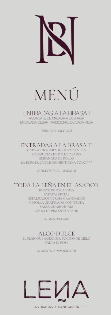 El viaje comienza con la frescura y personalidad del Termes Blanco 2023, que acompaña a entrantes a la brasa como el aguacate de Málaga y la ensalada César de vaca vieja. El icónico Numanthia 2011 Magnum acompaña elaboraciones tan emblemáticas como “La burger que le dio sentido a todo”. El potente y equilibrado Numanthia 2008 se sirve junto al ribeye de vaca vieja, coronado con guarniciones y salsas que realzan su sabor. Y, para cerrar, los postres caseros de Leña se elevan con la complejidad de un vino legendario: Numanthia 1999 Magnum.