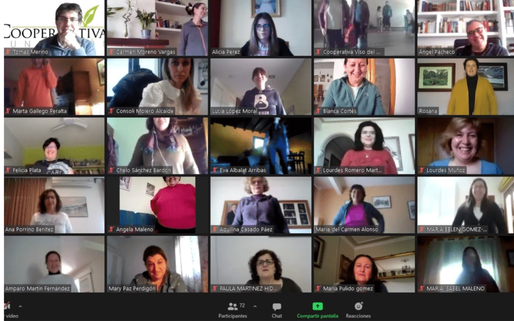 Las federaciones de Cooperativas Agro-alimentarias de Andalucía, de Castilla-La Mancha y de Extremadura han querido unir a trabajadoras y socias en un taller virtual de risoterapia para fortalecer la red de contactos entre las cerca de 145.000 mujeres cooperativistas que conforman las tres federaciones, aumentar su confianza e impulsar su motivación con el objetivo de animar su participación en los órganos de decisión de sus cooperativas.